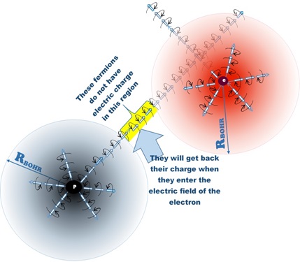 A figura mostra a interação das estruturas atomísticas de um próton e um elétron, conforme proposto no livro Subtle is the Math. Observe que a interação elétrica entre o próton e o elétron ocorre somente no espaço limitado pelo raio de Bohr, tanto no campo do próton quanto do elétron. Isso ocorre porque a densidade do vácuo quântico (que possibilita a interação entre duas partículas da estrutura atomística) só é suficiente para possibilitar a interação elétrica na região limitada pelo raio de Bohr. Essa é uma Lei fundamental da Natureza.