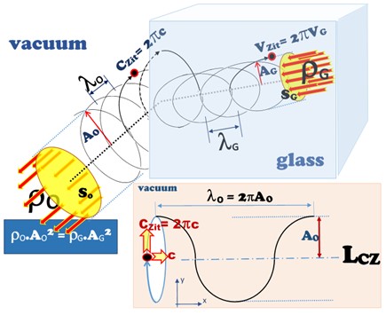 Então, quando a luz vinda do ar entra na água, como o fluxo do éter permanece constante, o raio da trajetória helicoidal diminui com a luz que entra na água (porque a velocidade da luz dentro da água também diminuiu).