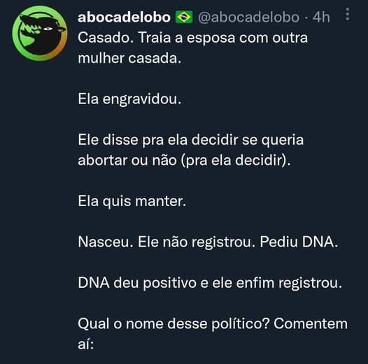 E essa história do Jair Bolsonaro já ter defendido que o aborto tem que ser uma decisão do casal? Inclusive na do 04 quem decidiu manter foi a ex-esposa. 🫢🫣 (…)
