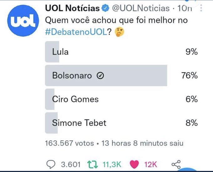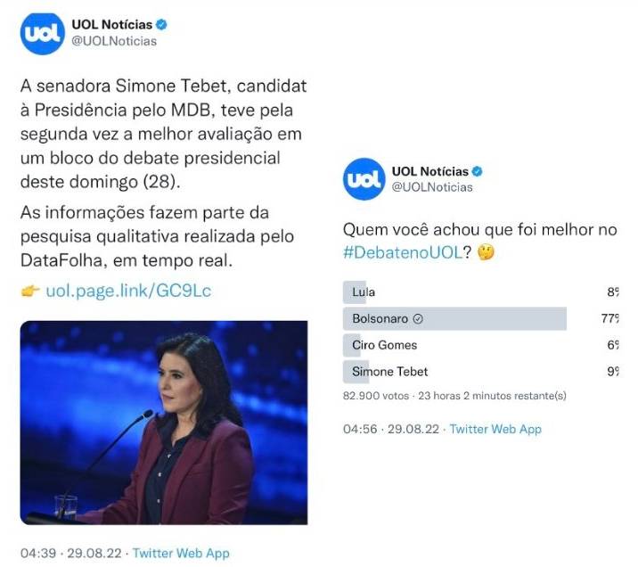 "Para dizer que a Tebet foi a melhor (hahaha) do debate e Bolsonaro o pior, o Datafolha fez uma "pesquisa" com 60 (!) pessoas. E ainda deu os percentuais: Tebet "venceu" com "43% dos votos", o que dá incríveis 26 pessoas.
