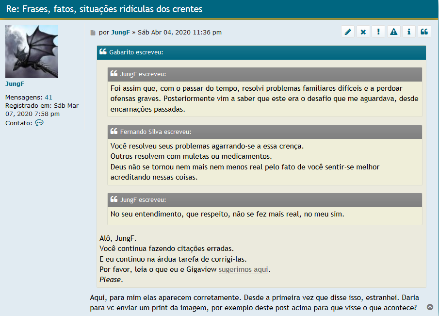 Postagem com citações erradas, em que você apresenta a sua última fala dentro de uma citação: