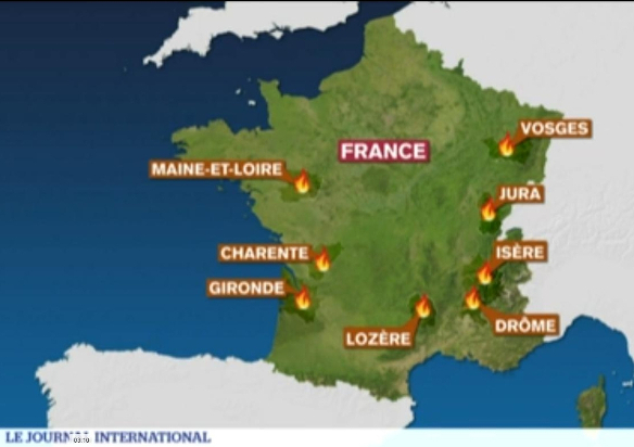 Na França, há incêndios por toda parte com um monte de desabrigados.
