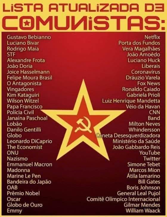Não encontrei Sérgio Moro e Nando Moura na lista. Mas o que me surpreendeu mesmo foi o véio da Havan. Quando foi que ele cometeu o crime de apologia ao comunismo (questionar o Messias)?Fernando Silva escreveu: ↑Seg, 17 Agosto 2020 - 13:44 pmTalvez ficasse melhor no tópico sobre teorias da conspiração ...