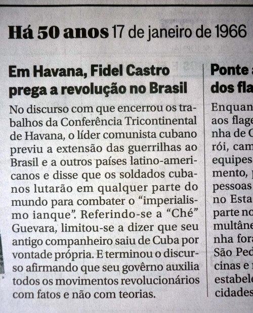 https://www1.folha.uol.com.br/fsp/brasi ... 200117.htm"Denise mostra que Fidel apoiou a “revolução” brasileira mesmo antes de 1964. “Quanto à revolução brasileira, Cuba apoiou a formação de guerrilheiros, desde o momento em que assumiu a função de exportar a revolução, quando o Brasil vivia sob o regime de democrático do governo João Goulart, ou seja, antes da instauração da ditadura. A maior parte foi treinada a partir de 1968, quando Cuba já havia se voltado para a construção do socialismo em único país, com o apoio da URSS. Embora um caso isolado, chegou a haver treinamento mesmo ao longo de 1973, quando a guerrilha no Brasil já estava aniquilada, à exceção da guerrilha do PC do B, no Araguaia (1972-1974)."