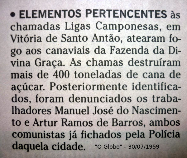 Fontes:"Julião continua a defender a distribuição de terras e recebe o apoio do voto popular: em 1958 é reeleito deputado estadual pelo PSB. O movimento que lidera havia crescido, conquistando projeção internacional. Em uma época de discursos inflamados e revoluções (ver texto abaixo), as Ligas Camponesas chamam a atenção de líderes como Fidel Castro e Mao Tsé-tung, que têm encontros pessoais com Julião e membros de sua família."