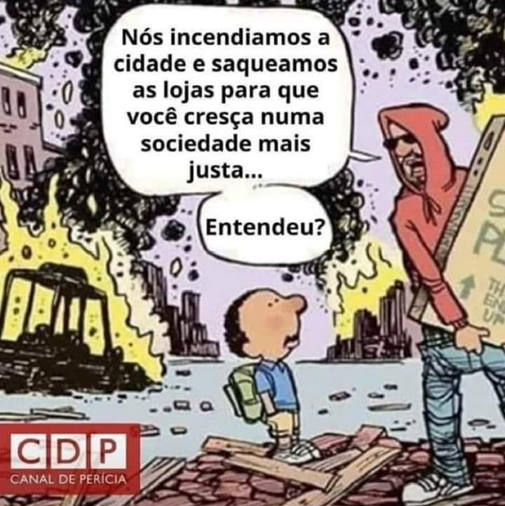 De outro, aqueles caras vestidos de preto, cobrindo o rosto não com máscaras coronavírus, mas com capuzes de bandidos, jogando bombas caseiras e pedras na polícia, incendiando pneus e caçambas de lixo, fumaça, correria, gritaria, os caras apavorando.