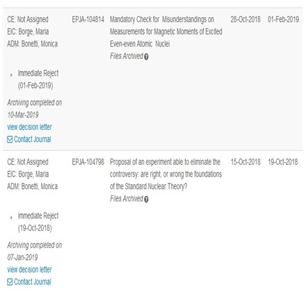 Obrigado por enviar seu artigo mencionado acima para EPJ A “Hadrons and Nuclei”. O conteúdo do artigo não está correto. Tenta generalizar a ausência de dados de momentos magnéticos para os 2+ estados de núcleos conjugados para invalidar a teoria. Alguns dos casos que você mencionou foram medidos e há boa concordância com os cálculos do modelo de casca. Recomendo que você leia, por exemplo, PRL114 (2015) 062501 e até a antiga compilação de NJ Stone, Atomic Data and Nuclear Data Table 90 (2005) 75 onde alguns momentos magnéticos para 2+ estados já são dados. Portanto, não posso aceitar sua contribuição para publicação na EPJ A. Atenciosamente