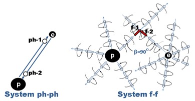 1- Sistema ph-ph, onde uma coleção de fótons é trocada entre um par próton-elétron, promovendo a atração de Coulomb, conforme proposto no QED. Para analisar a diferença entre os dois sistemas, apenas dois fótons ph-1 e ph-2 estão sendo levados em consideração.